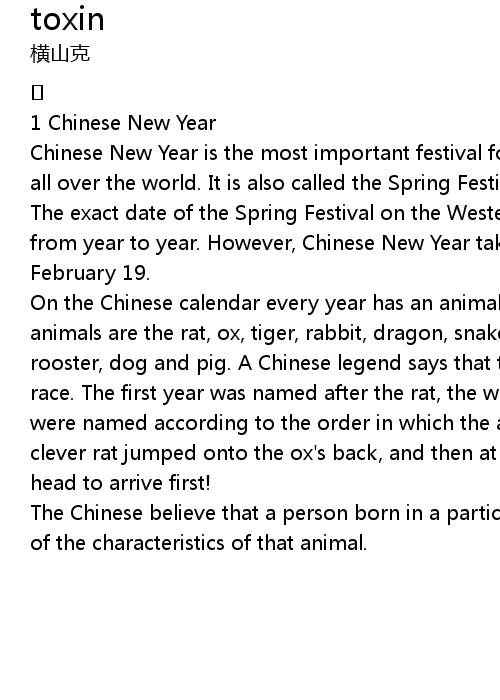 | [00:32.396] | On the Chinese calendar every year has an animal' s name. These animals are the rat, ox, tiger, rabbit, dragon, snake, horse, ram, monkey, rooster, dog and pig. A Chinese legend says that these twelve animals had a race. The first year was named after the rat, the winner. The other eleven years were named according to the order in which the animals arrived in the race. The clever rat jumped onto the ox' s back, and then at the end jumped over the ox' s head to arrive first! |