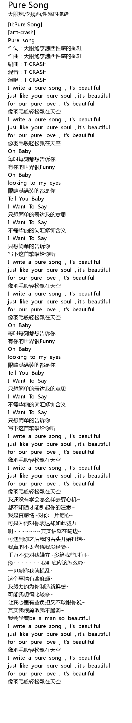 | [00:19.863] | I write a pure song , it' s beautiful |