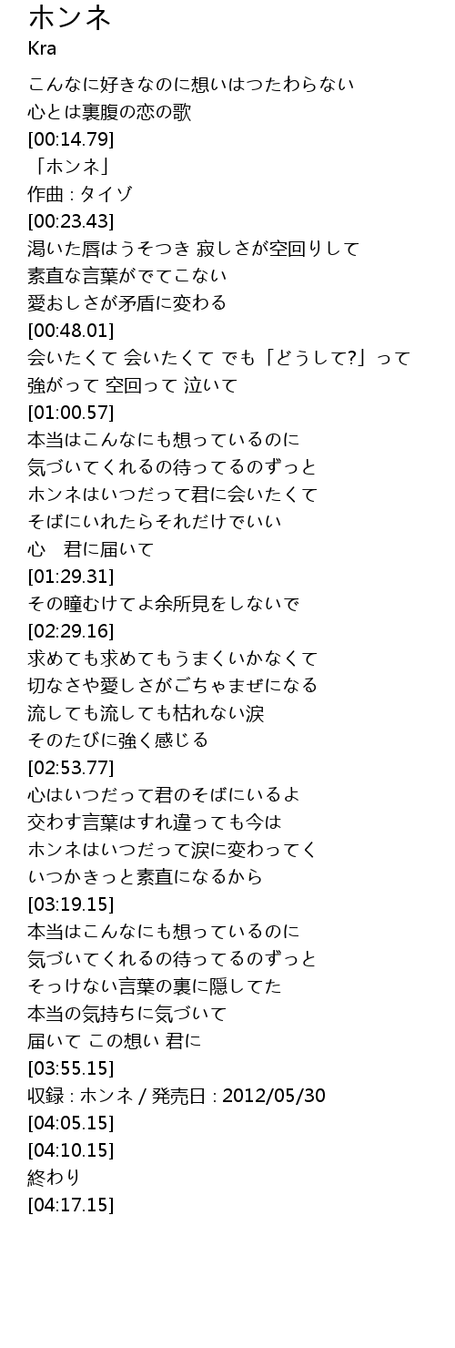| [04:00.15] | 収録∶ホンネ/発売日∶2012/05/30 |