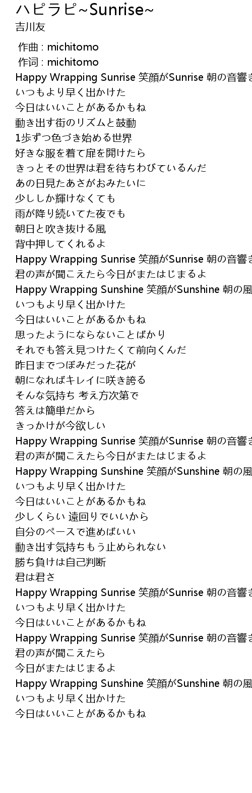 | [00:00.10] | Happy Wrapping Sunrise 笑顔がSunrise 朝の音響きだすよ |