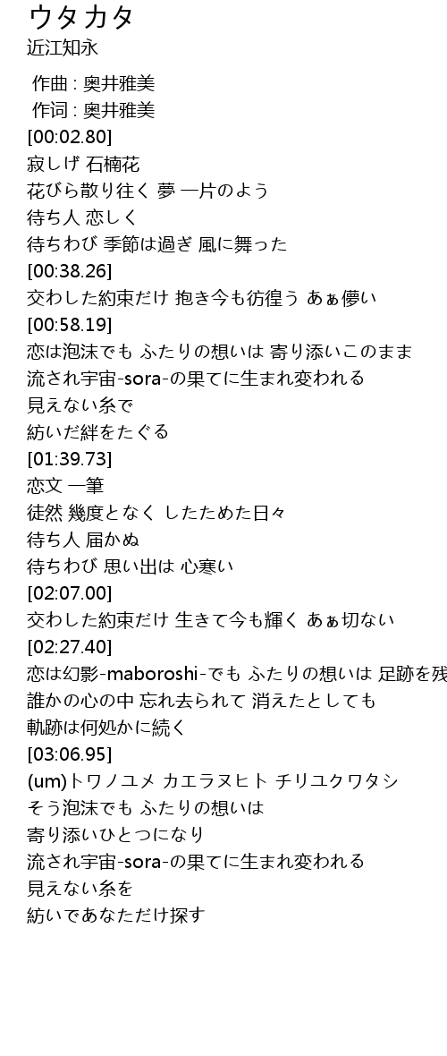 | [03:47.21] | そう泡沫でも ふたりの想いは 寄り添いひとつになり |