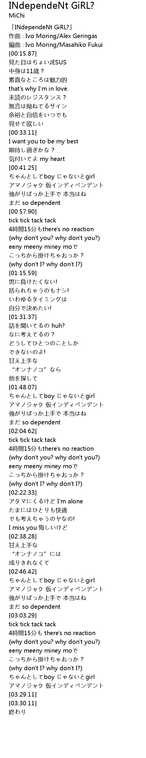 | [00:00.87] | 「INdependeNt GiRL?」 |