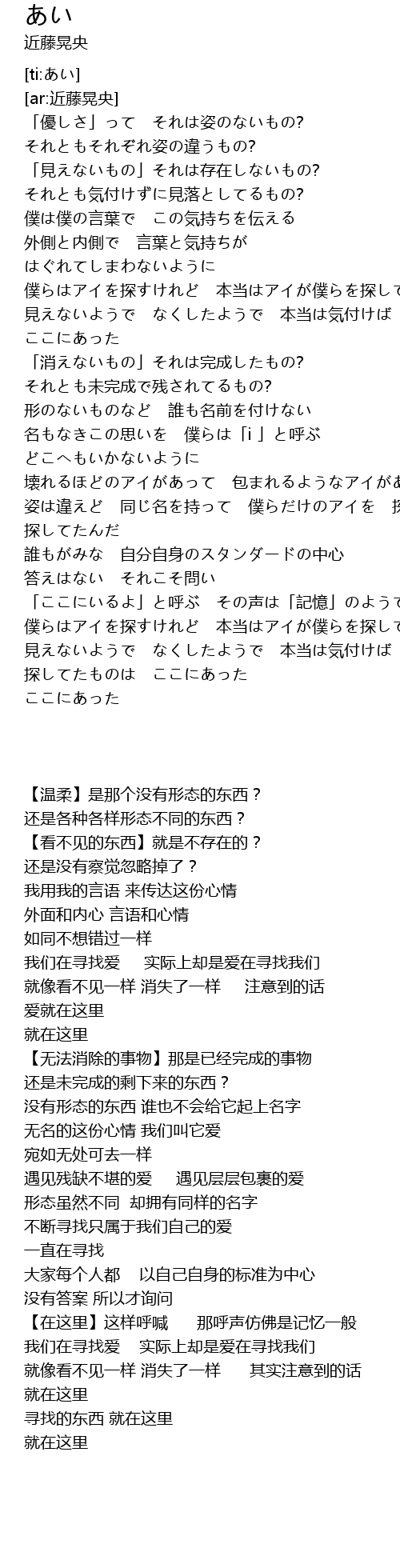 | [03:38.175] | 僕らはアイを探すけれど 本当はアイが僕らを探してた |