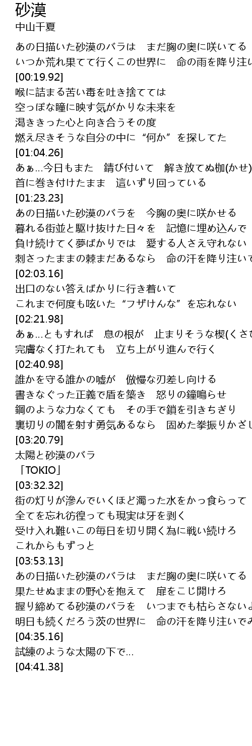 | [00:00.68] | あの日描いた砂漠のバラは まだ胸の奥に咲いてる |