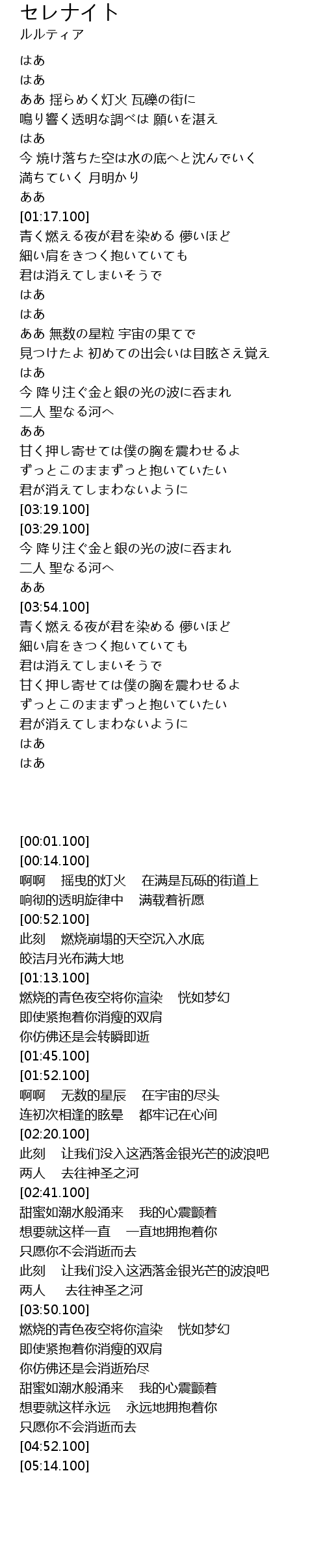 | [03:59.100] | 青く燃える夜が君を染める 儚いほど |
