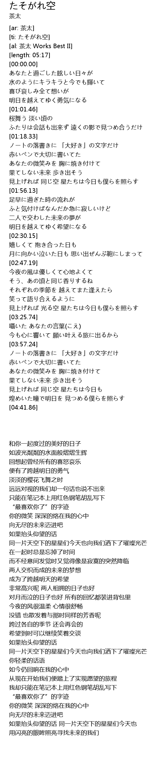 | [01:43.80] | 見上げれば 同じ空 星たちは今日も僕らを照らす |