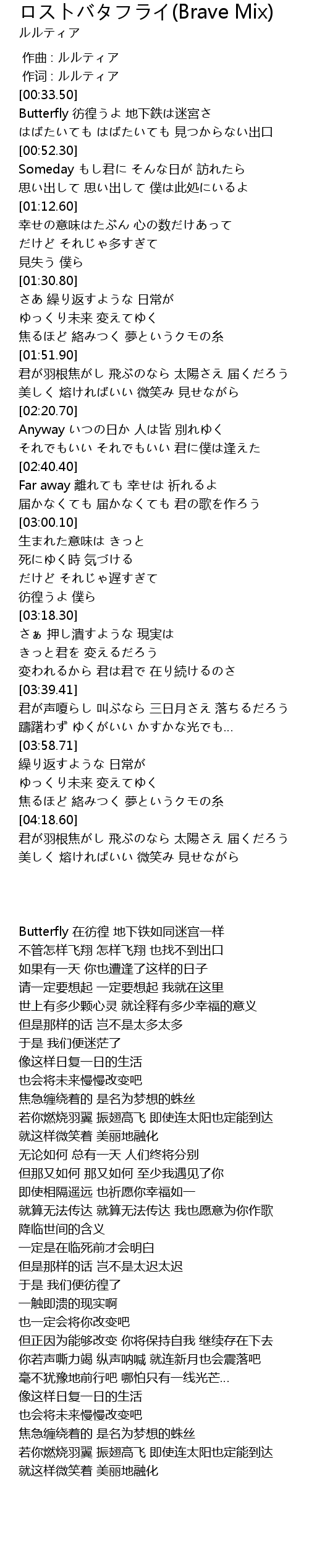 | [00:33.54] | Butterfly 彷徨うよ 地下鉄は迷宮さ |