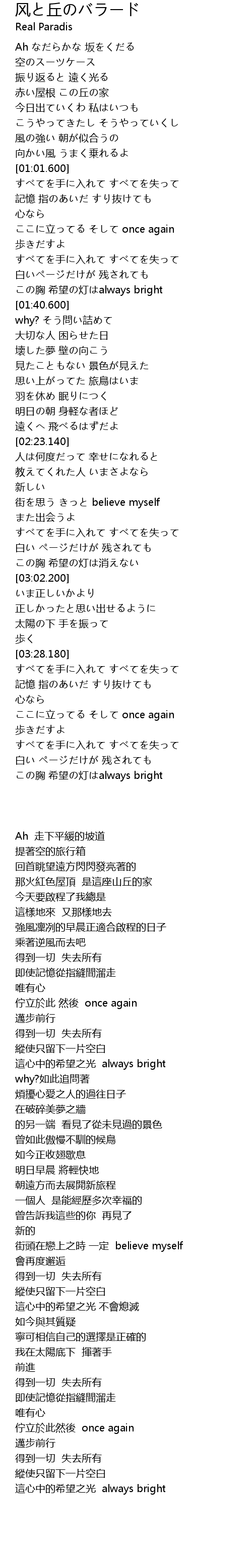 | [01:14.190] | ここに立ってる そして once again |