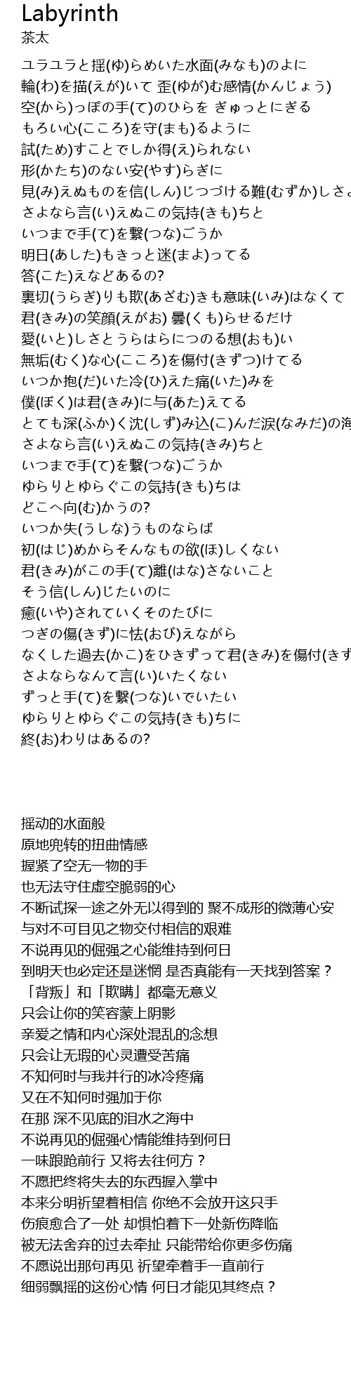 | [02:42.340] | さよなら言(い)えぬこの気持(きみ)ちと いつまで手(て)を繋(つな)ごうか |