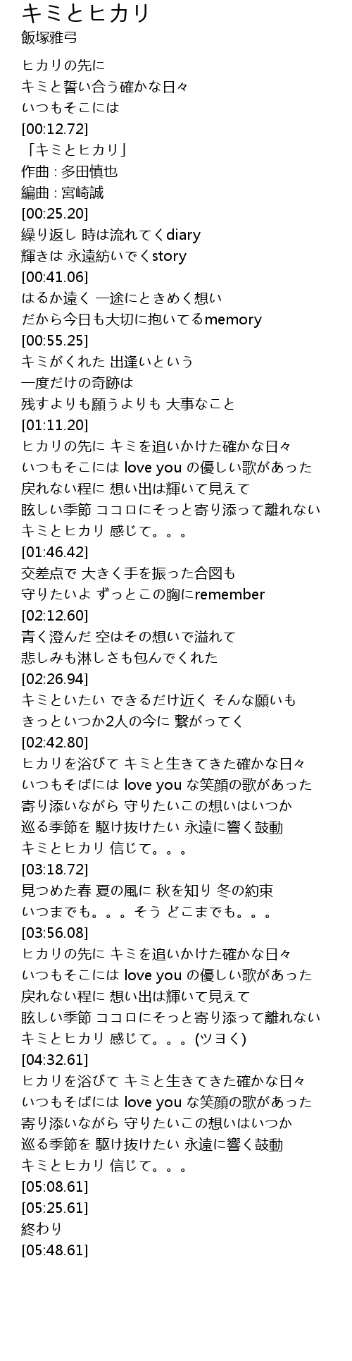 | [03:13.56] | キミとヒカリ 信じて。。。 |