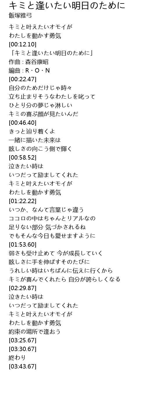 | [00:15.47] | 「キミと逢いたい明日のために」 |