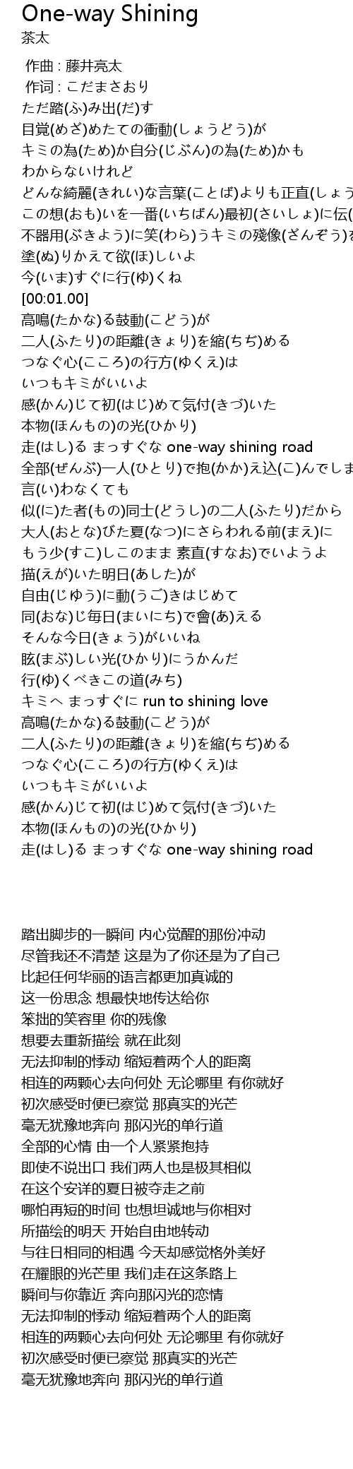 | [01:16.350] | 走(はし)る まっすぐな one-way shining road |