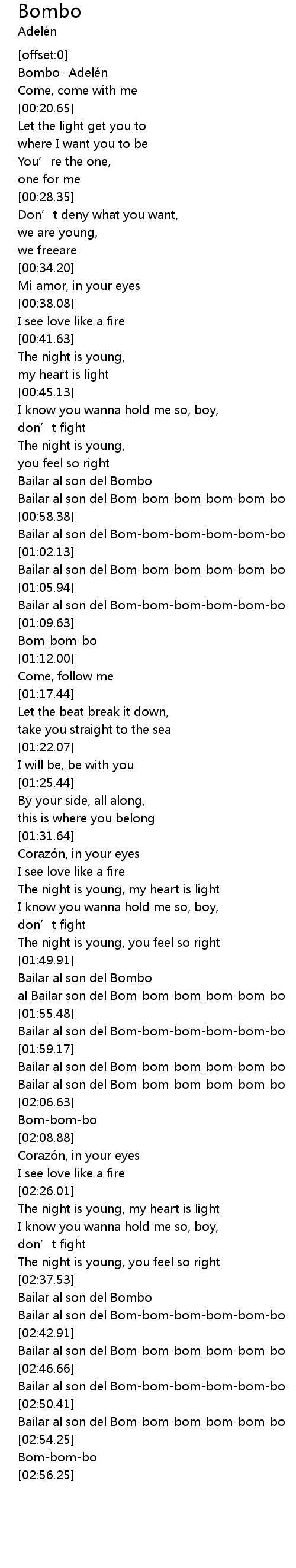 | [02:00.11] | Bailar al son del Bombombombombombo |