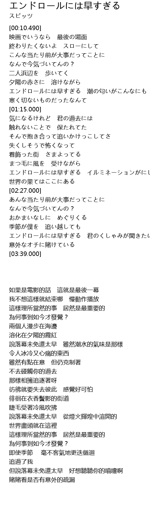 | [03:25.000] | エンドロールには早すぎる 君のくしゃみが聞きたいよ |