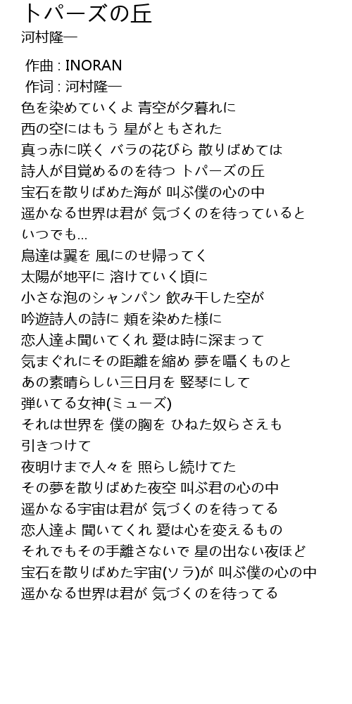 | [00:49.090] | 詩人が目覚めるのを待つ トパーズの丘 |