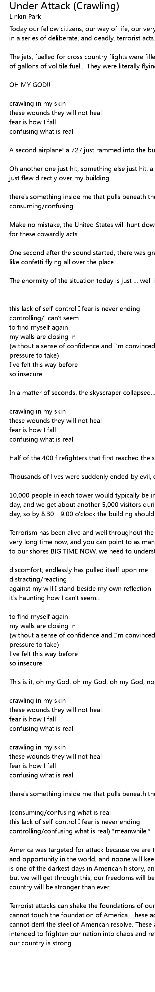 America was targeted for attack because we are the brightest beacon for freedom, and opportunity in the world, and noone will keep that light from shining. This is one of the darkest days in American history, and it's an on-going nightmare but we will get through this, our freedoms will be intact and the spirit of this country will be stronger than ever. |