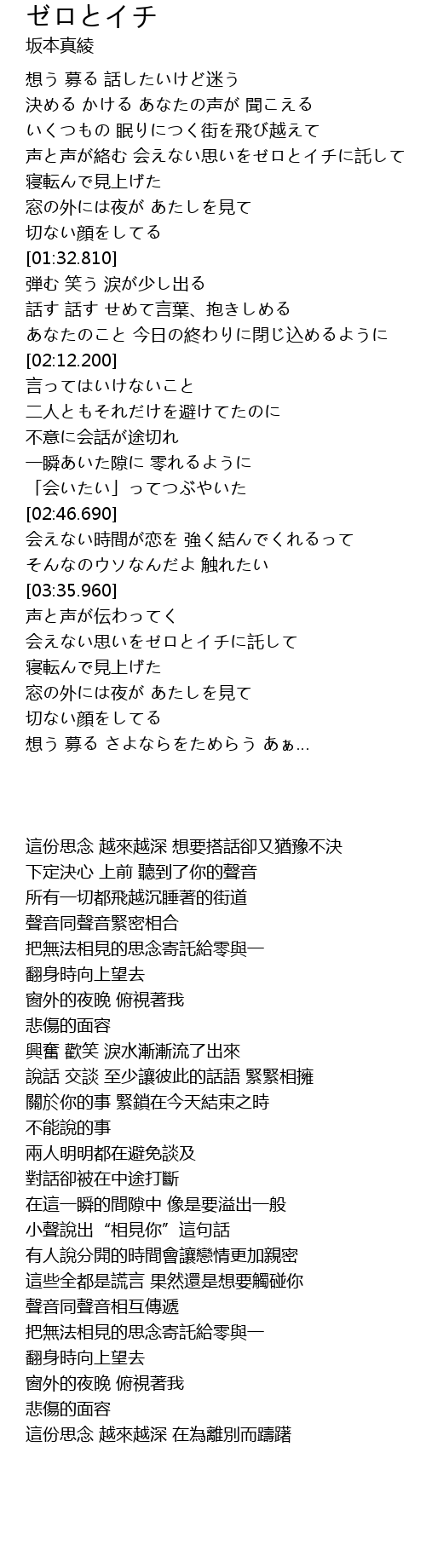 | [03:42.930] | 把無法相見的思念寄託給零與一 |