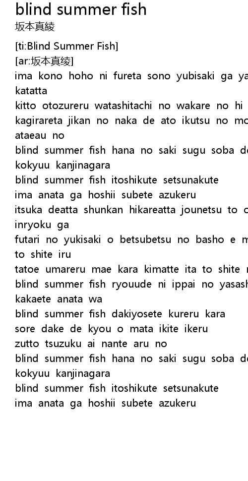 | [00:54.94] | blind summer fish hana no saki sugu soba de anata no |