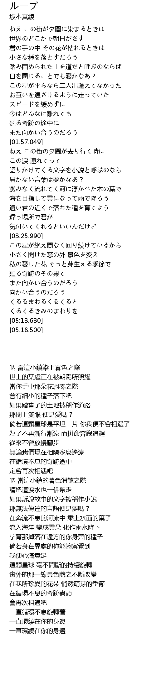 | [01:16.509] | この星が平らなら二人出逢えてなかった |
