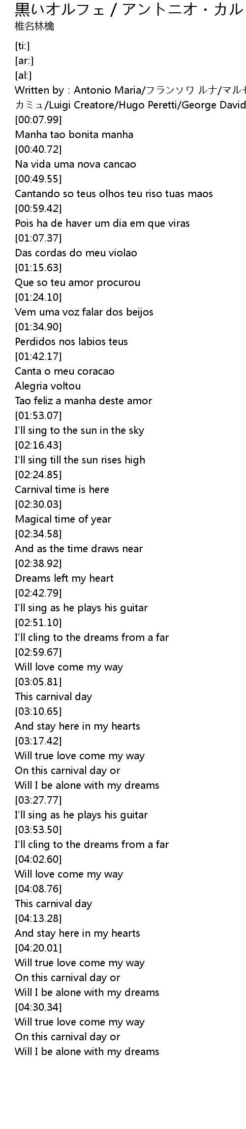 | [00:04.04] | Written by:Antonio Maria/フランソワ ルナ/マルセル カミュ/Luigi Creatore/Hugo Peretti/George David Weiss/Luiz Bonfa |