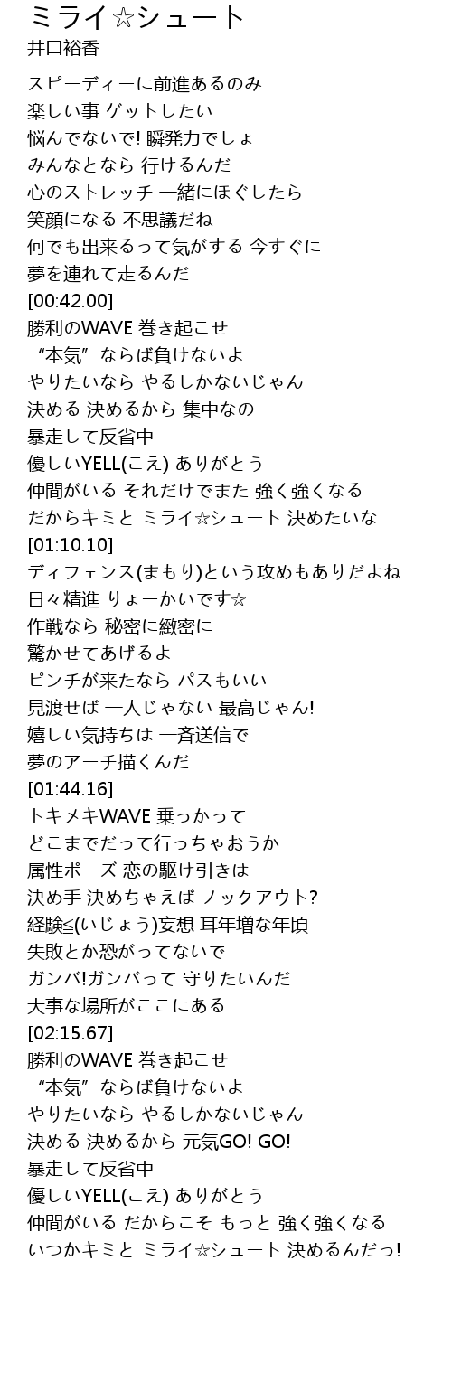 | [01:02.56] | だからキミと ミライ☆シュート 決めたいな |