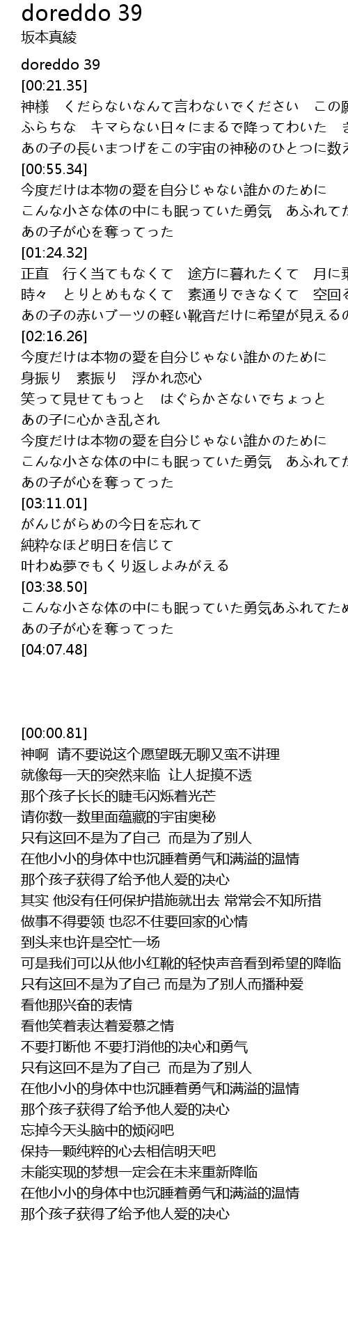 | [00:45.74] | 那个孩子长长的睫毛闪烁着光芒 请你数一数里面蕴藏的宇宙奥秘 |