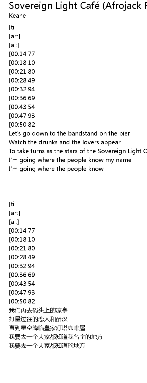 | [02:20.78][00:50.82] | And watch night coming down on the Sovereign Light Cafe |