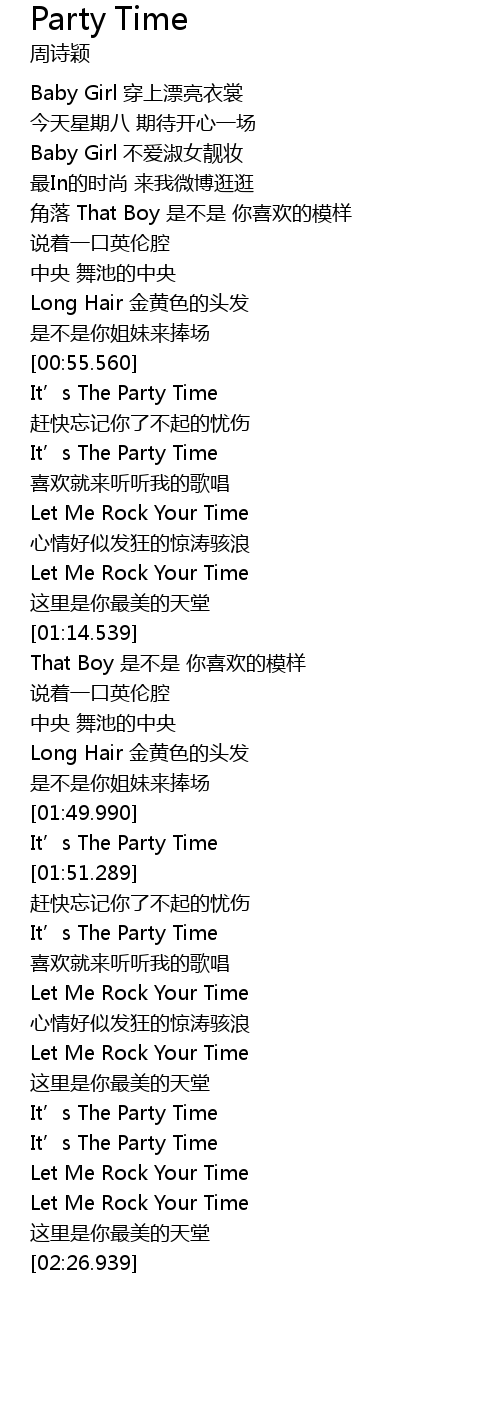 | [02:10.288] | It' s The Party Time |