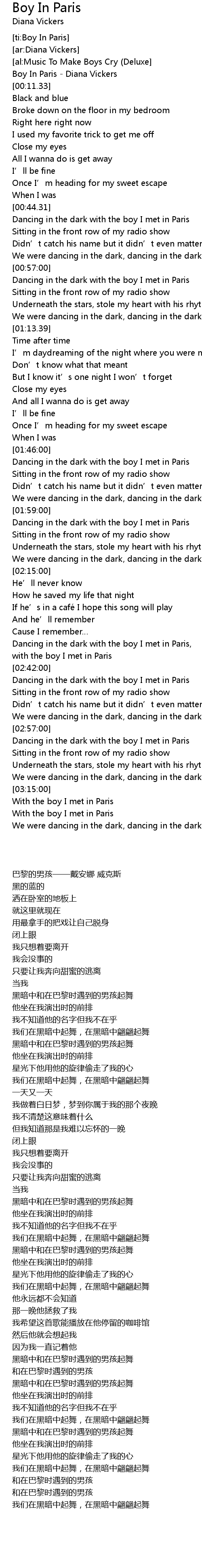 | [00:00.00] | Boy In Paris - Diana Vickers |