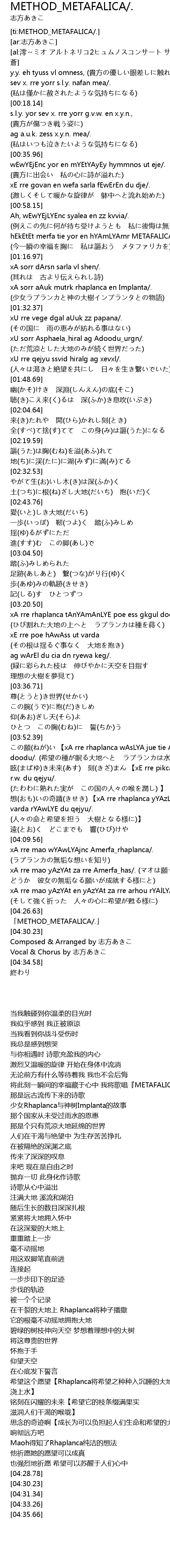 | [01:07.43] | hEkEtEt merfa tie yor en hYAmLYAmr METAFALICA! (今一瞬の幸福を胸に 私は謳おう メタファリカを) |
