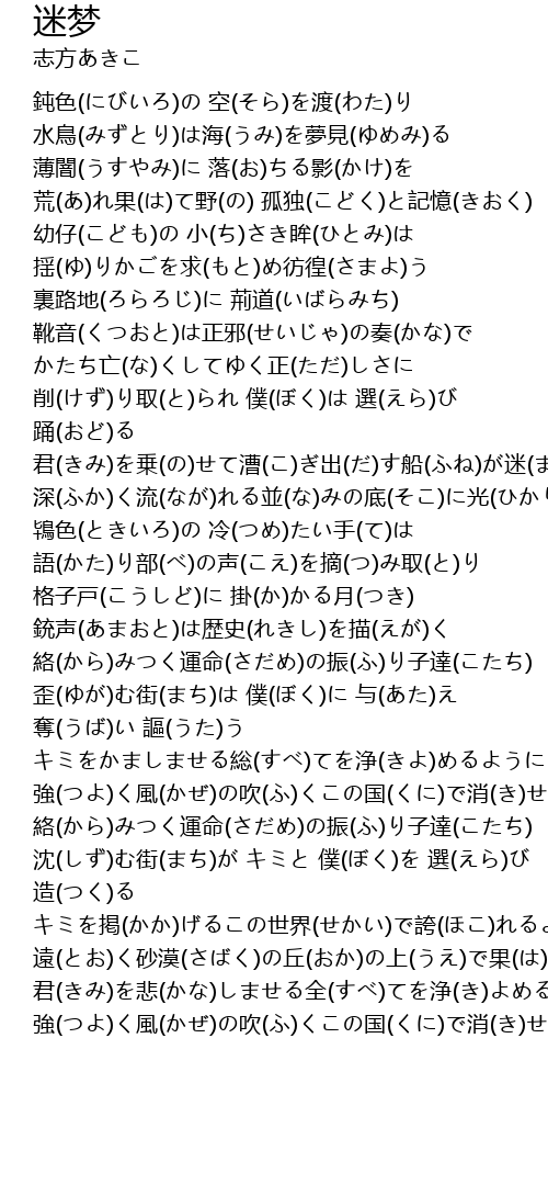 | [01:59.950] | 鴇色(ときいろ)の 冷(つめ)たい手(て)は 語(かた)り部(べ)の声(こえ)を摘(つ)み取(と)り |