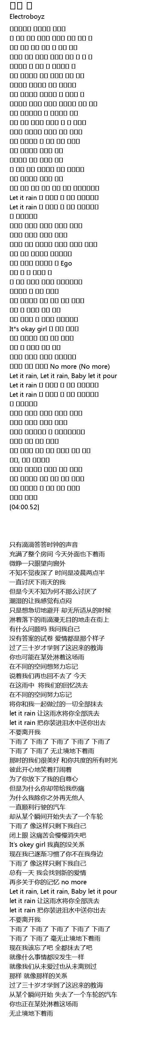 | [02:35.80] | Let it rain 이 빗물에 널 모두 씻어버릴래 |