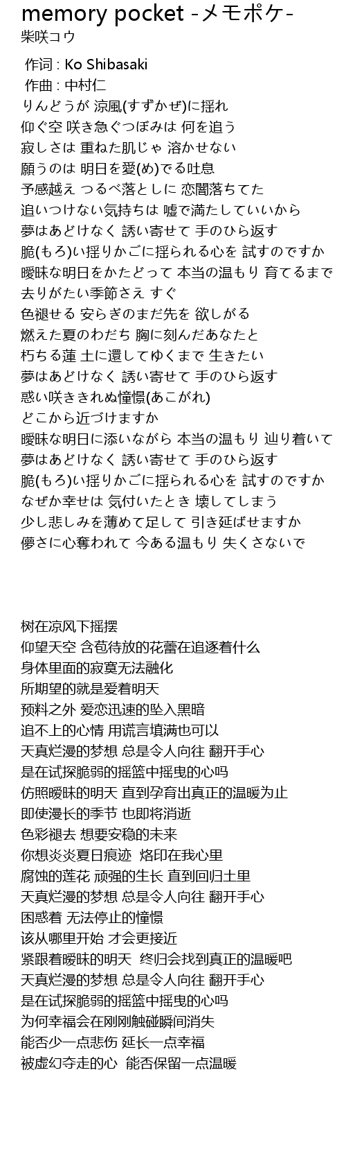 | [00:00.000] | 作词 : Ko Shibasaki |