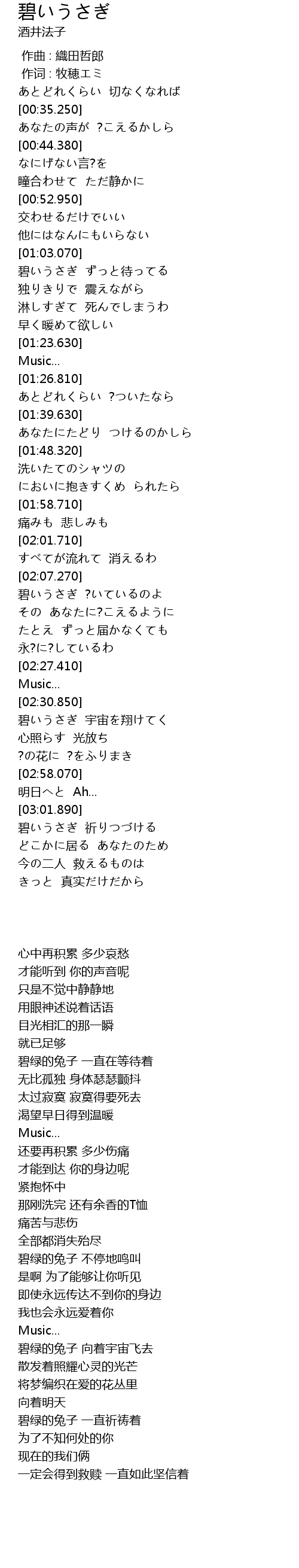 | [03:03.880] | 碧いうさぎ 祈りつづける |