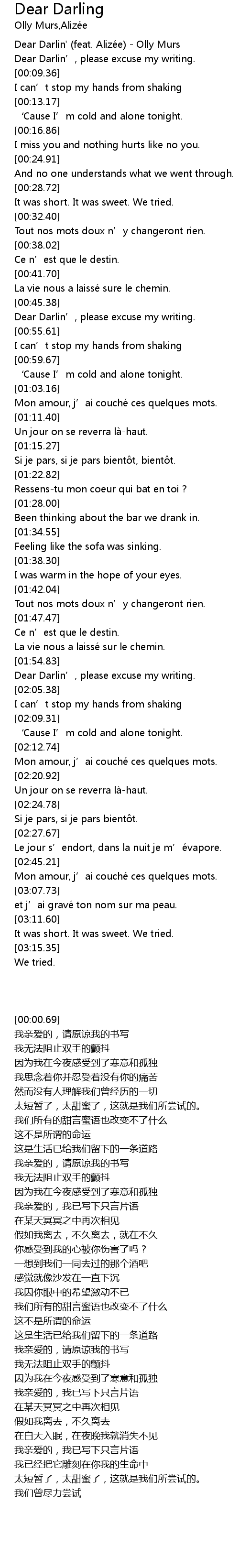 | [00:00.69] | Dear Darlin' (feat. Alizée) - Olly Murs |