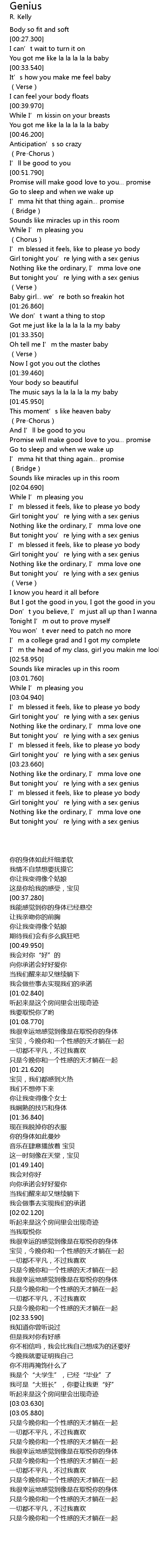 | [03:20.600] | Girl tonight you’re lying with a sex genius |