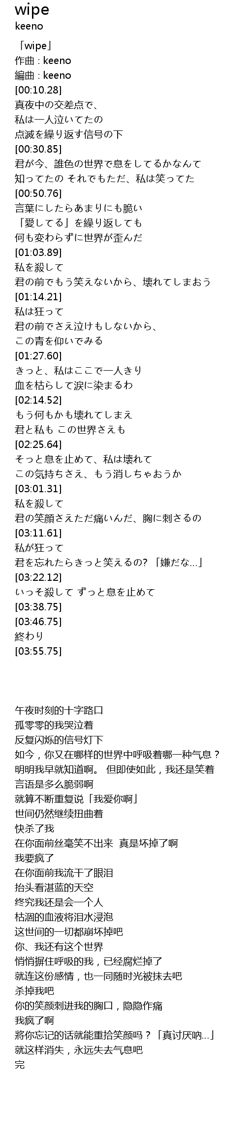 | [03:22.73] | いっそ殺して ずっと息を止めて |
