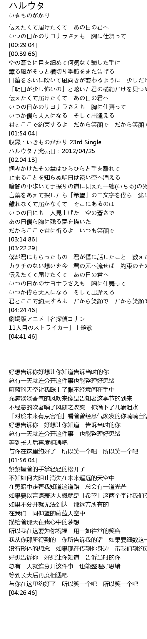 | [01:56.04] | 収録:いきものがかり 23rd Single ハルウタ/発売日:2012/04/25 |