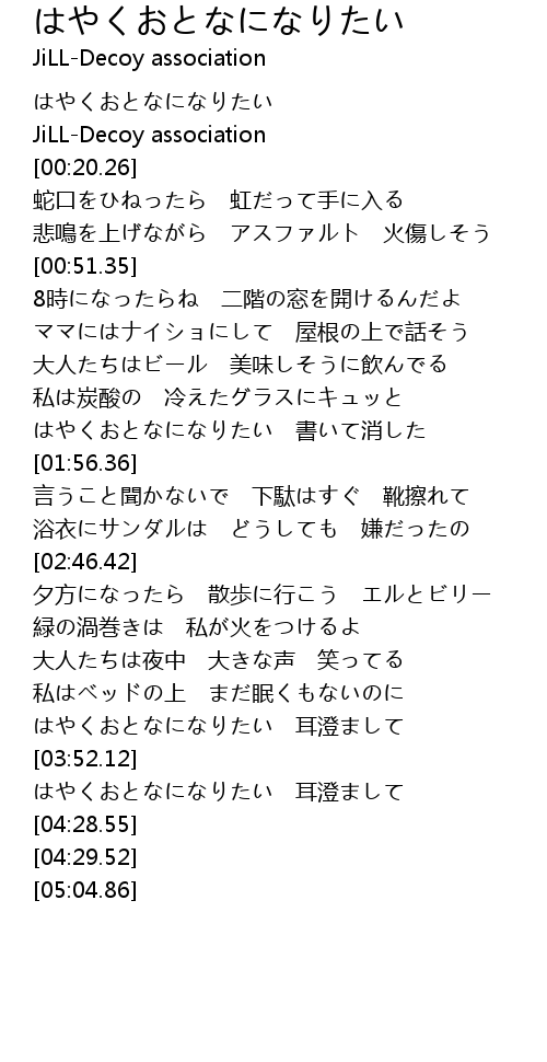 | [04:15.72] | はやくおとなになりたい 耳澄まして |