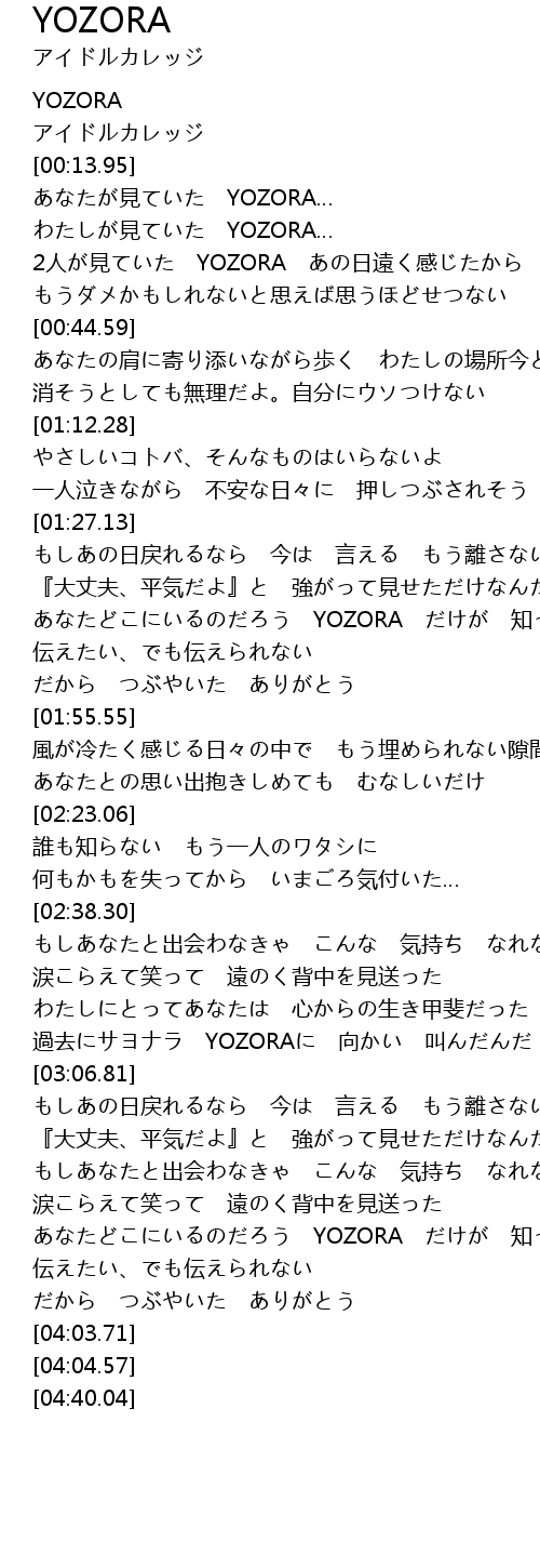 | [03:49.39] | あなたどこにいるのだろう YOZORA だけが 知っている |