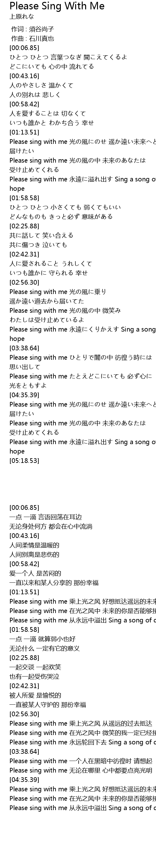 | [05:02.50] | Please sing with me 永遠に溢れ出す Sing a song of dream and hope |
