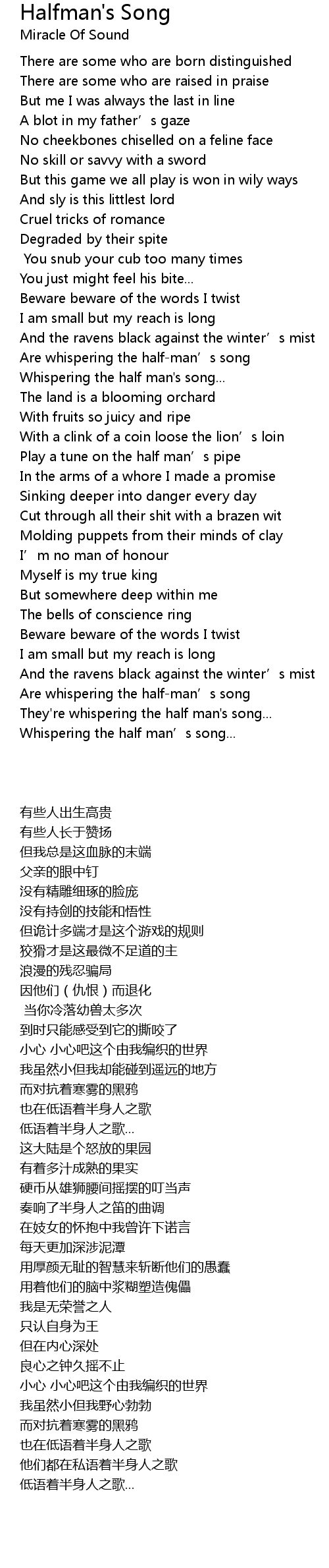| [02:40.08] | Are whispering the halfman' s song |