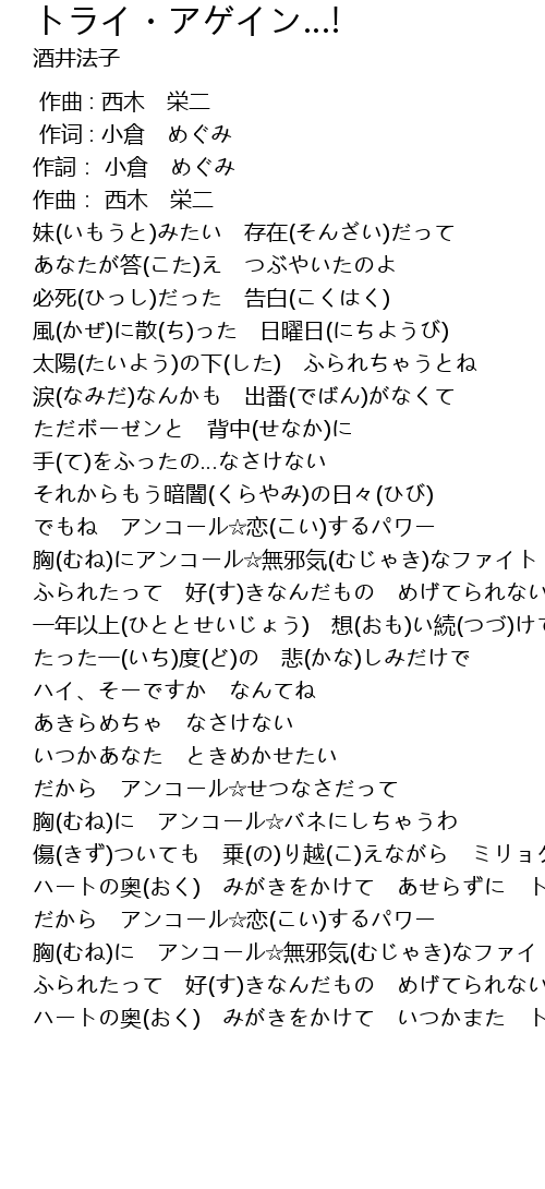 | [02:57.254] | ハートの奥(おく) みがきをかけて いつかまた トライAgain! |