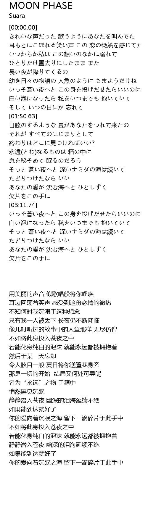 | [03:42.32] | 白い泡になったら 私をいつまでも 抱いていて |