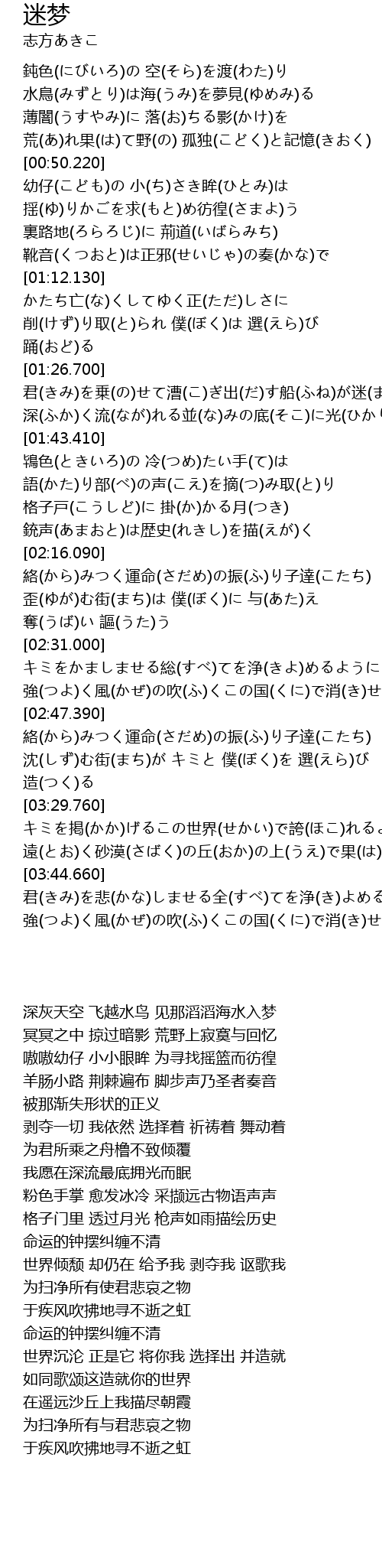 | [01:59.950] | 鴇色(ときいろ)の 冷(つめ)たい手(て)は 語(かた)り部(べ)の声(こえ)を摘(つ)み取(と)り |