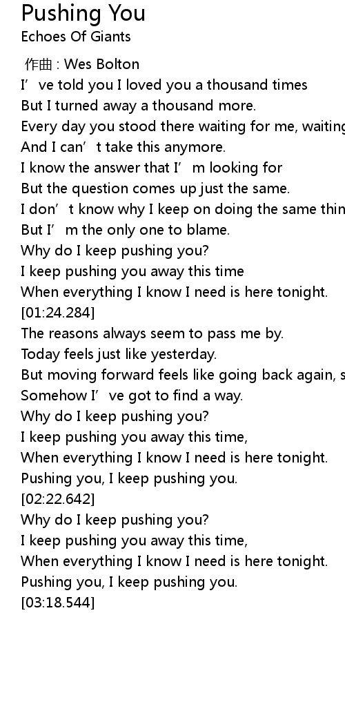 | [01:50.015] | Why do I keep pushing you? |