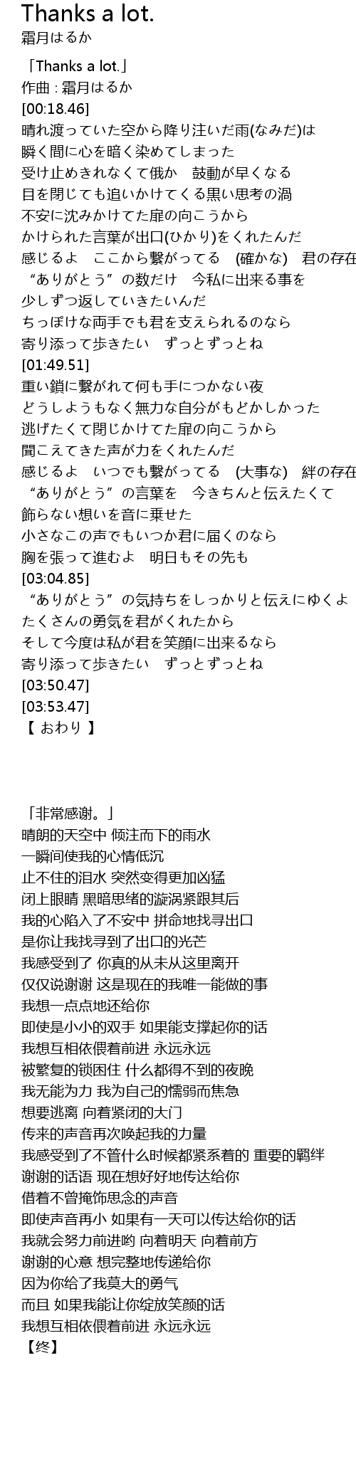 | [01:26.30] | “ありがとう”の数だけ 今私に出来る事を |