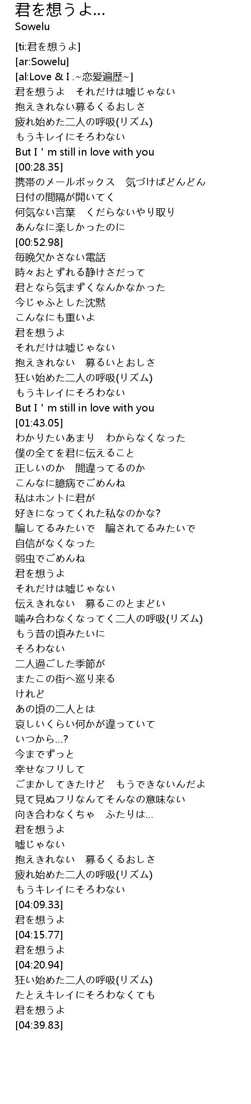 | [00:03.02] | 君を想うよ それだけは嘘じゃない |