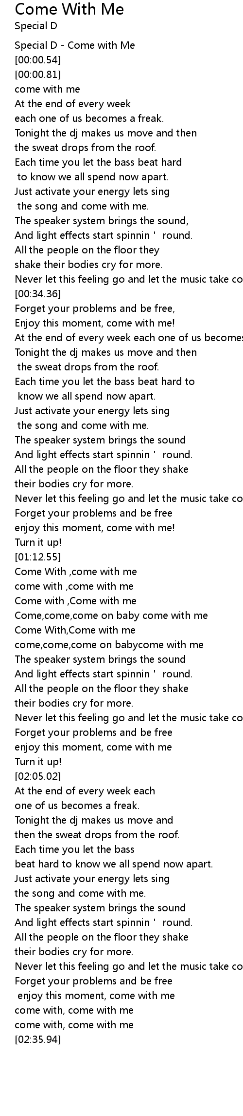 | [00:31.31] | Never let this feeling go and let the music take control. |