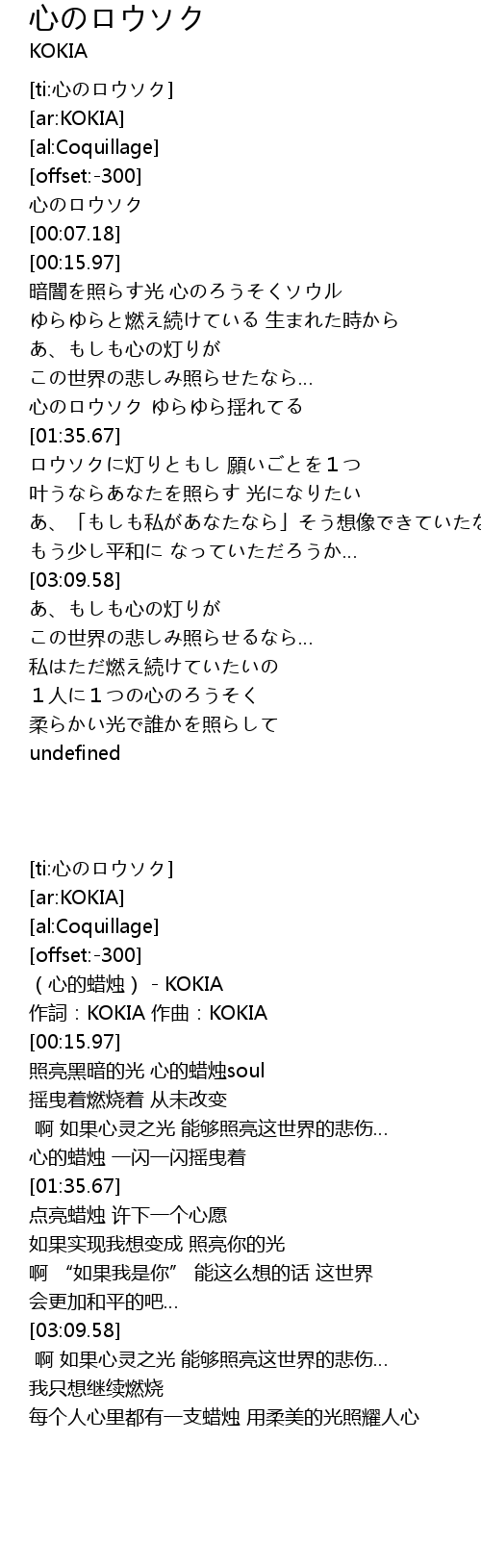 | [00:00.58] | (心的蜡烛) - KOKIA |
